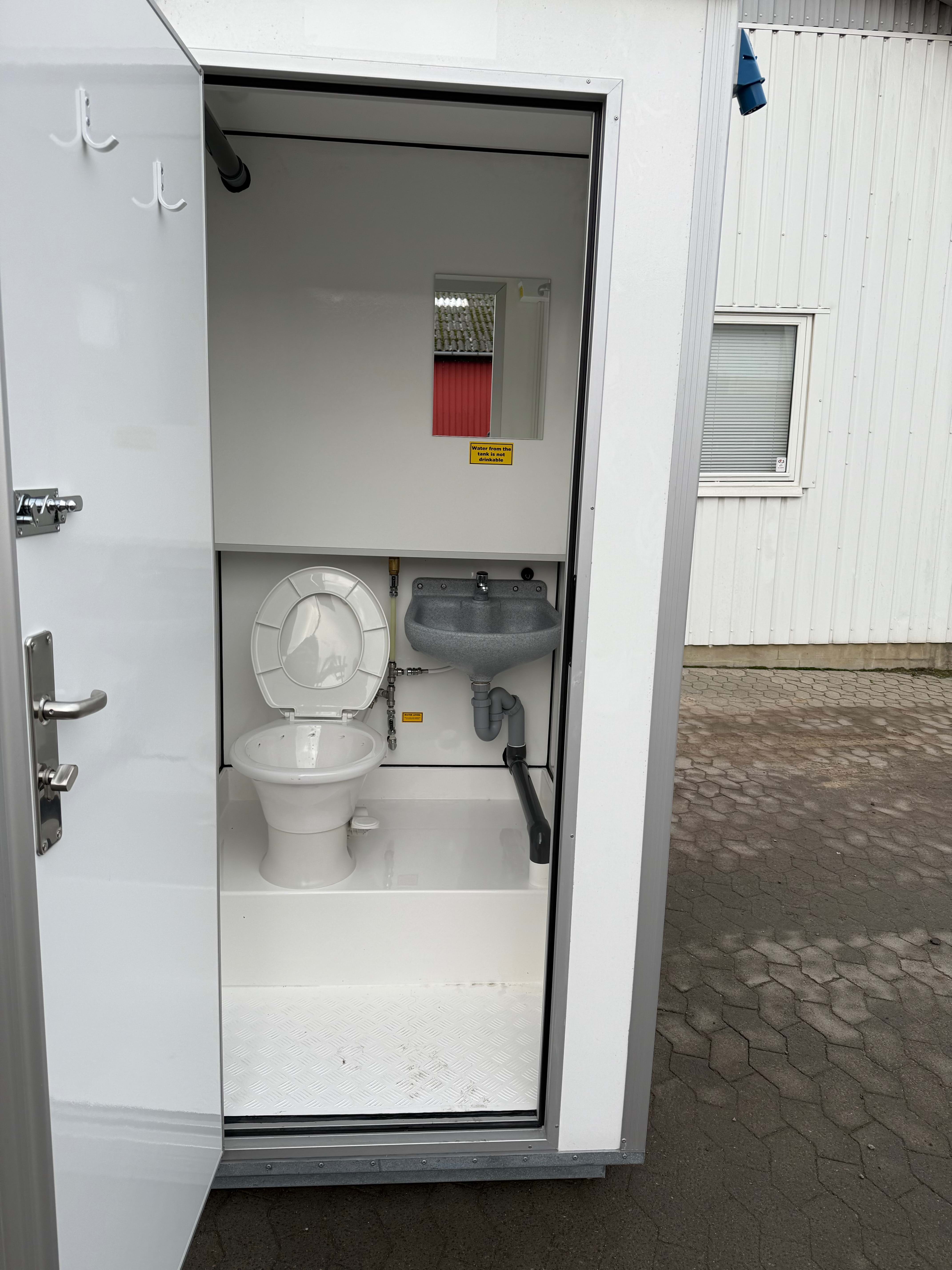Toiletvognen kan tilsluttes vand ligesom det er muligt at føre spildevandet direkte i en kloak via 110 mm kloakrør.